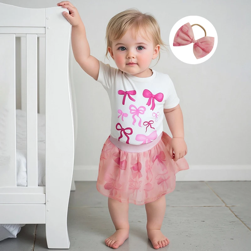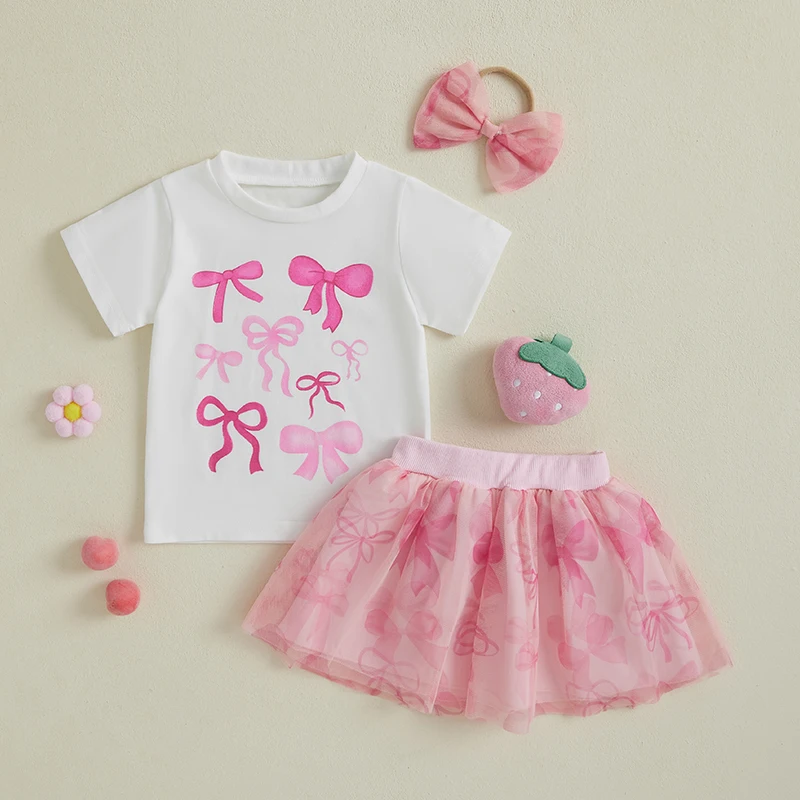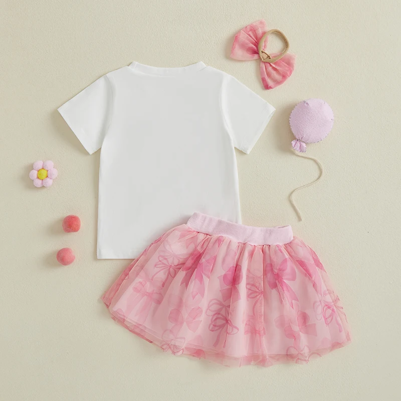 Girls Summer 3PCS Skirt Outfits Short Sleeve Bow Print Tops A-line Tulle Skirt Headband SetSize (cm)
