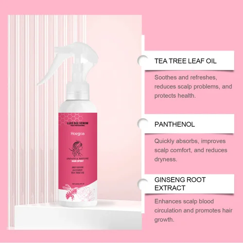 Our hair growth solution contains tea leaf oil, panthenol, ginseng root extract. It can effectively reduce hair loss and increase hair growth. The way to use it is very simple: spray an appropriate amount of this product on the scalp and apply evenly. Gently massage until absorbed. And the use of selected plant stems to take ingredients, safe and worry-free.